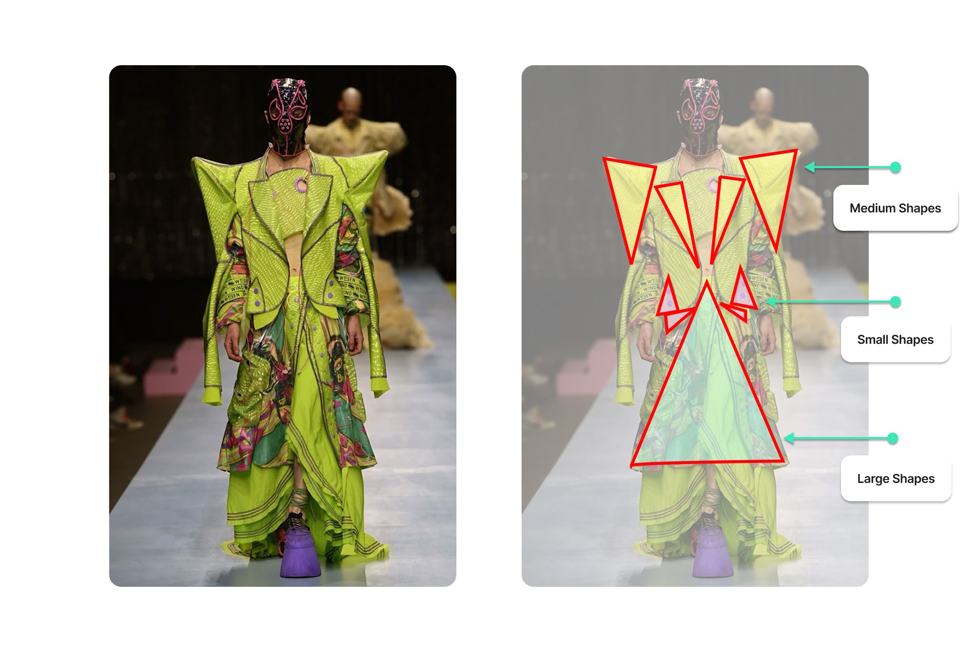 In the annotated reference image below, you can see this principle in action. The garment features predominantly green fabric with black contrast stitching that defines these different shapes. I've highlighted how these elements cluster into distinct grouping.