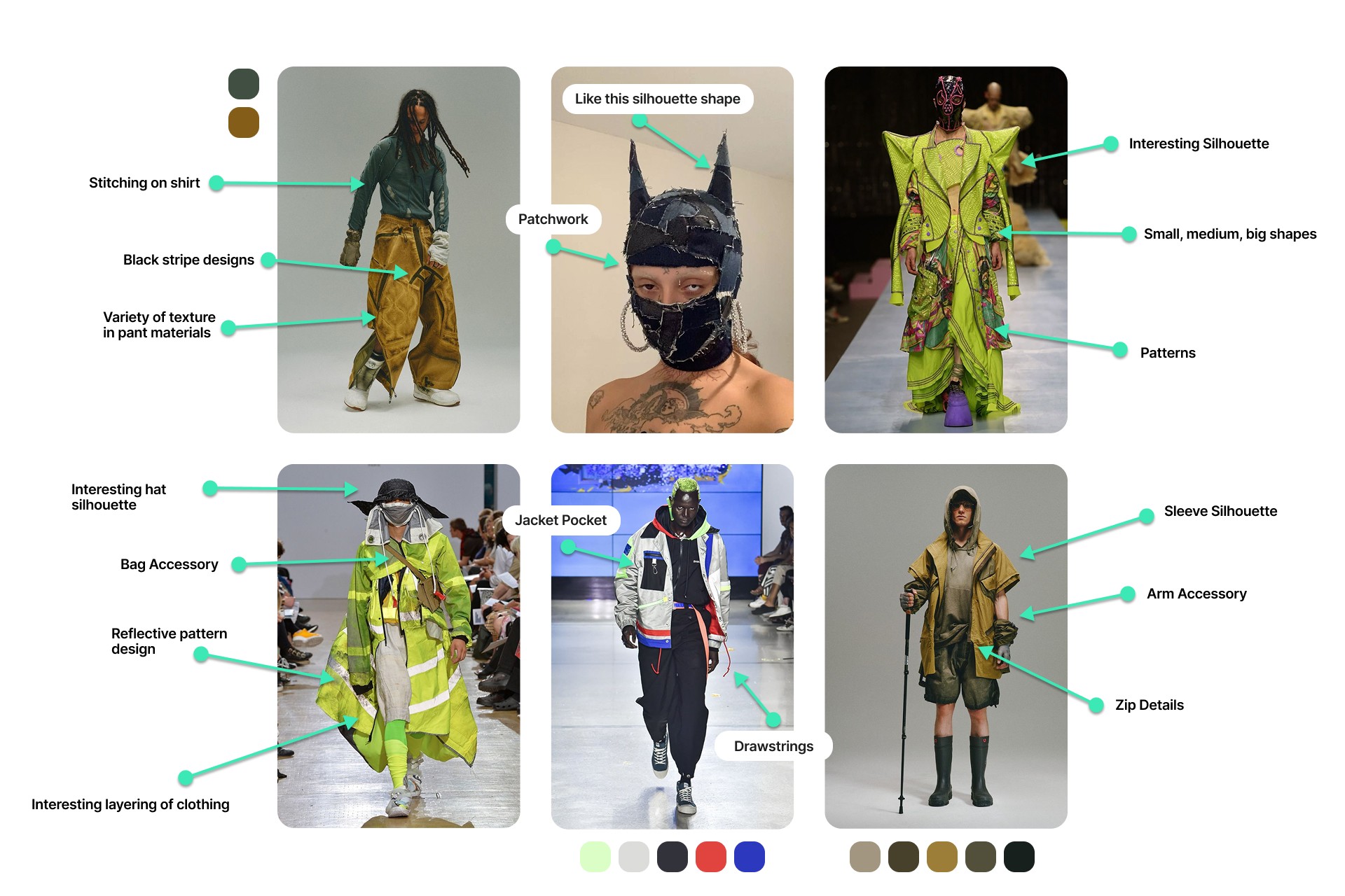 In the diagram below, I've labeled particular details that captured my attention in each image. This can be a good exercise for you to do yourself to turn reference images into an active analysis. Rather than mindlessly browsing inspiring images, try identifying elements that you resonate with. For example: a particular pocket placement, an interesting fabric treatment, a unique layering technique, etc.